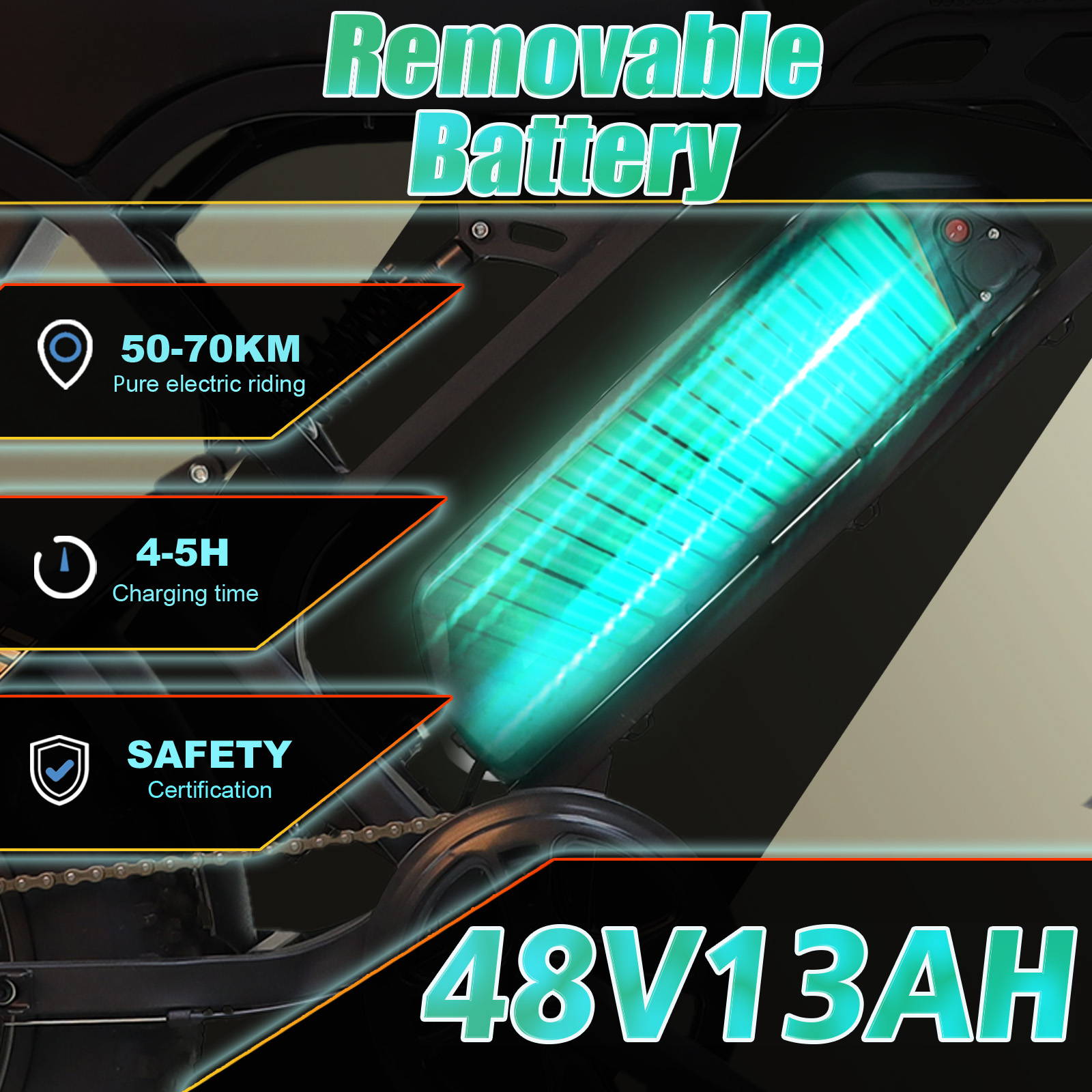 48V 13h power lithium battery. Range 40-60km for one full charge