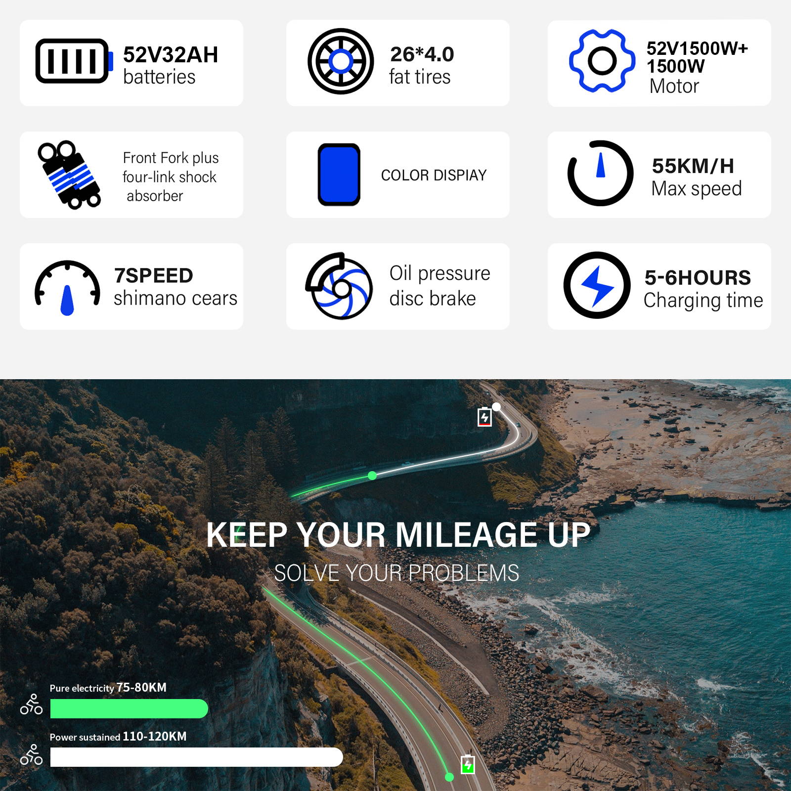 52V*32Ah lithium battery. Range 55-110km for one full charge